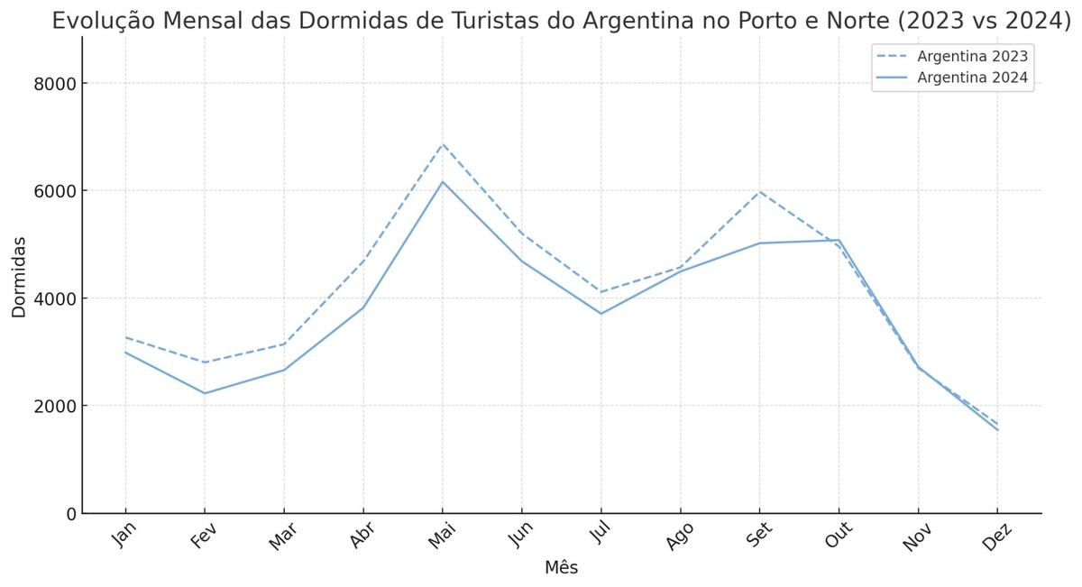 Apesar de ligeiras variações mensais, a distribuição mantém-se relativamente estável, o que evidencia a consistência da procura argentina pela região. Este padrão pode ser aproveitado para reforçar o posicionamento do Porto e Norte como destino cultural e gastronómico atrativo para o mercado sul-americano ao longo de todo o ano.