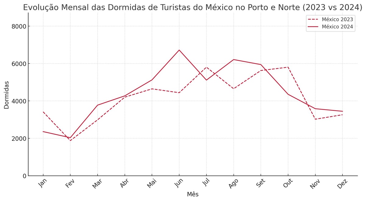 A procura mexicana revela níveis mais elevados de dormidas não apenas em junho e julho, mas também em agosto e setembro, sugerindo uma maior permanência durante o verão.
