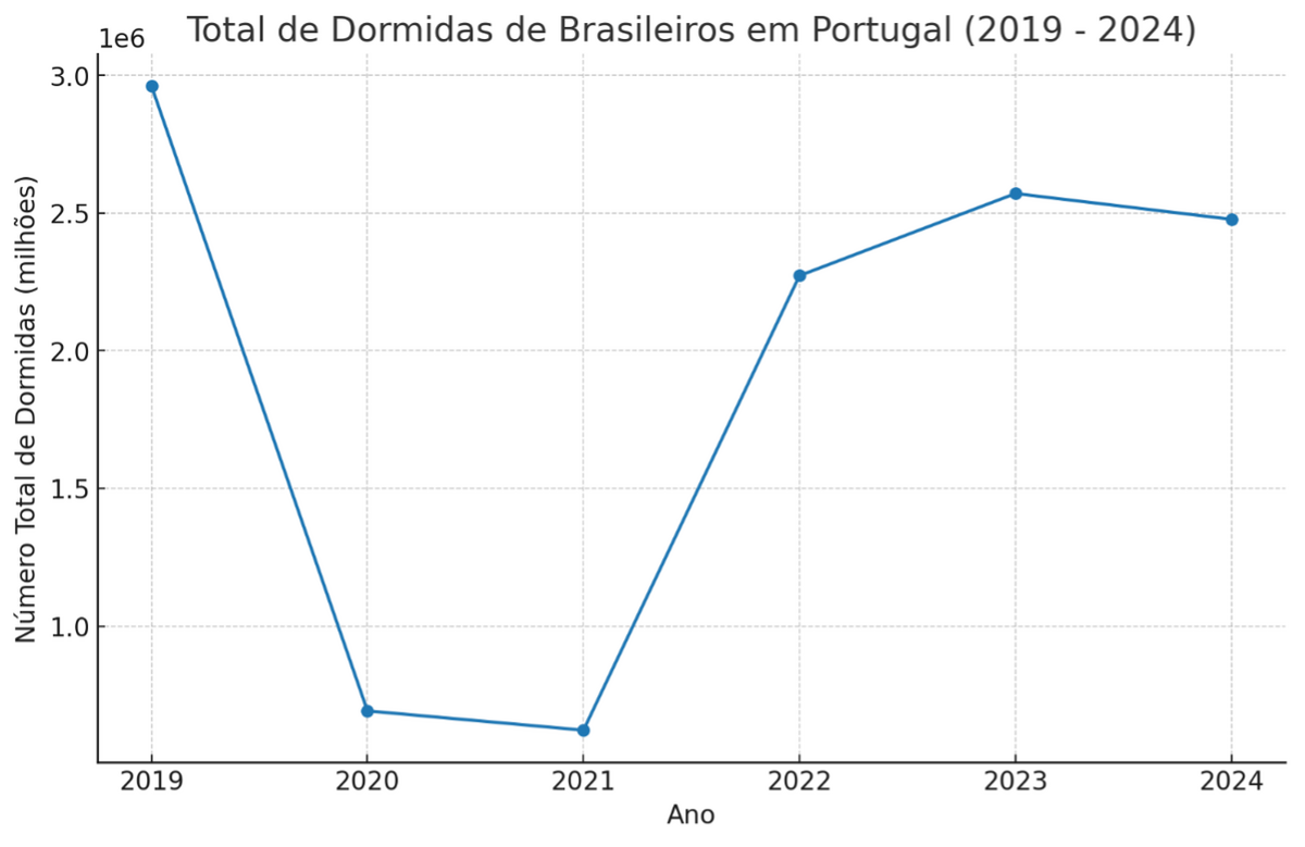 Em 2024, o Brasil foi o 7.º mercado de procura externa para Portugal, com uma quota de 4,4%, que corresponde a cerca de 2,5 milhões de dormidas, representando uma quebra de cerca de 3,6% relativamente a 2023.
