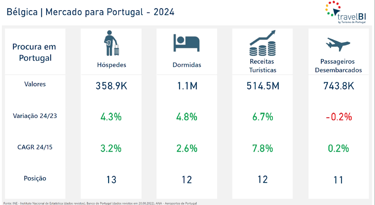 Portugal foi, em 2024, o 12.º mercado mais procurado pelos turistas belgas, que representaram 2% da quota de dormidas e 1,9% dos hóspedes no nosso país.
