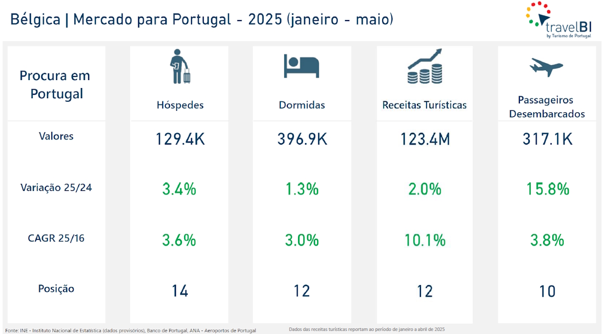 Nos primeiros meses de 2025 a hotelaria mantém-se no topo das preferências dos turistas belgas (67,2% das dormidas), com os hotéis de 4 estrelas a receberem 47,9% das dormidas.