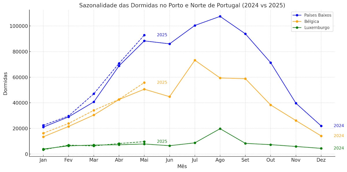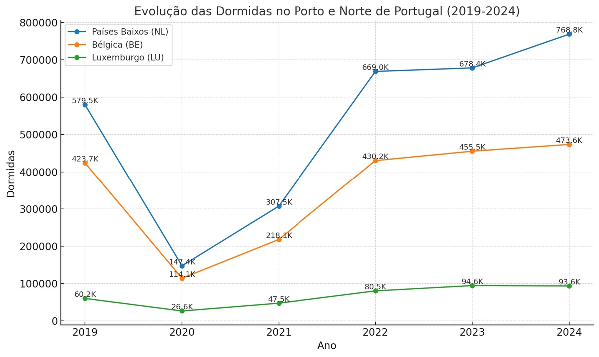 Portugal, e em particular, o Porto e Norte, têm beneficiado desta apetência, como se pode verificar no gráfico abaixo, que mostra a evolução das dormidas de turistas do Benelux desde 2019. Os dados relativos a 2024 demonstram que os números pré-pandemia já foram superados.