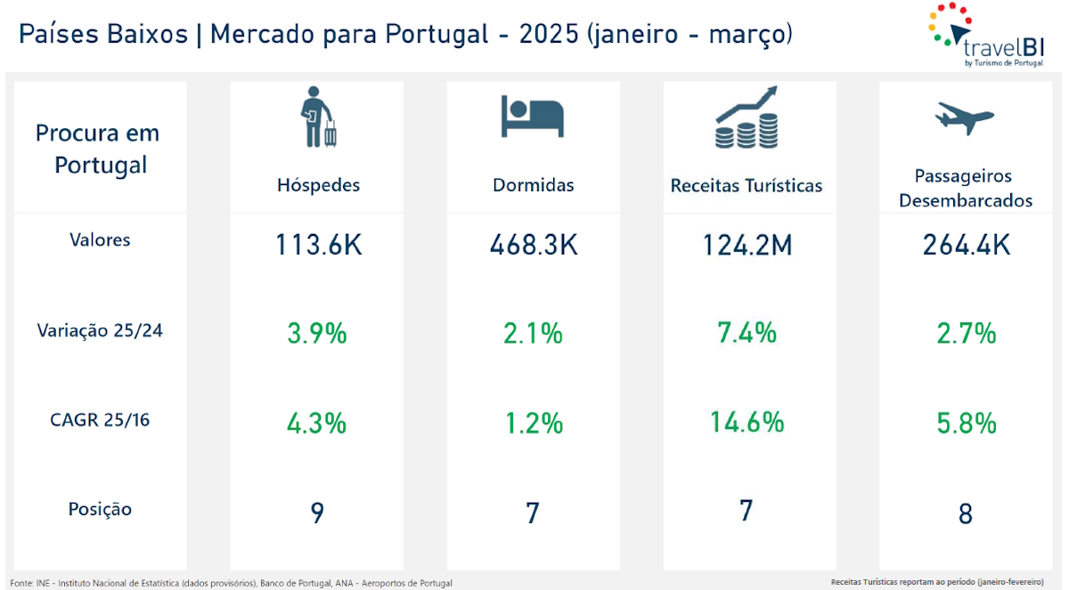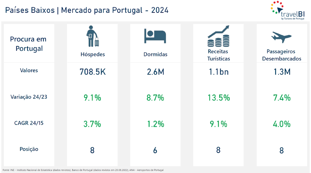 Os Países Baixos são um mercado turístico importante para Portugal, tendo ocupado, em 2024, a 6.ª posição no indicador dormidas (o que se reflete numa quota 4,6%) e o 8.º no indicador hóspedes (quota 3,7%).