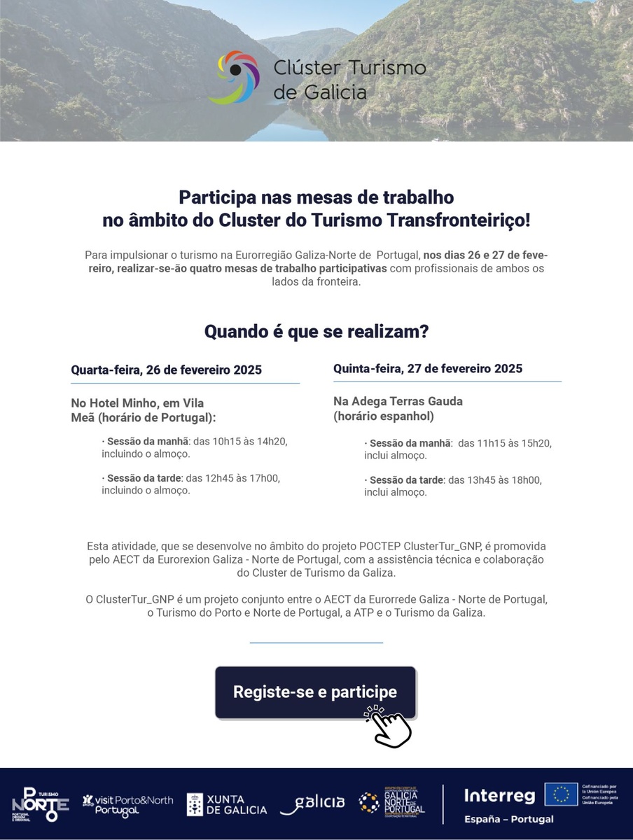 Estas sessões vão reunir empresas do Norte de Portugal e da Galiza para analisar a situação atual do turismo na Eurorregião, identificar pontos fortes, desafios e oportunidades e promover o networking entre os profissionais do setor.