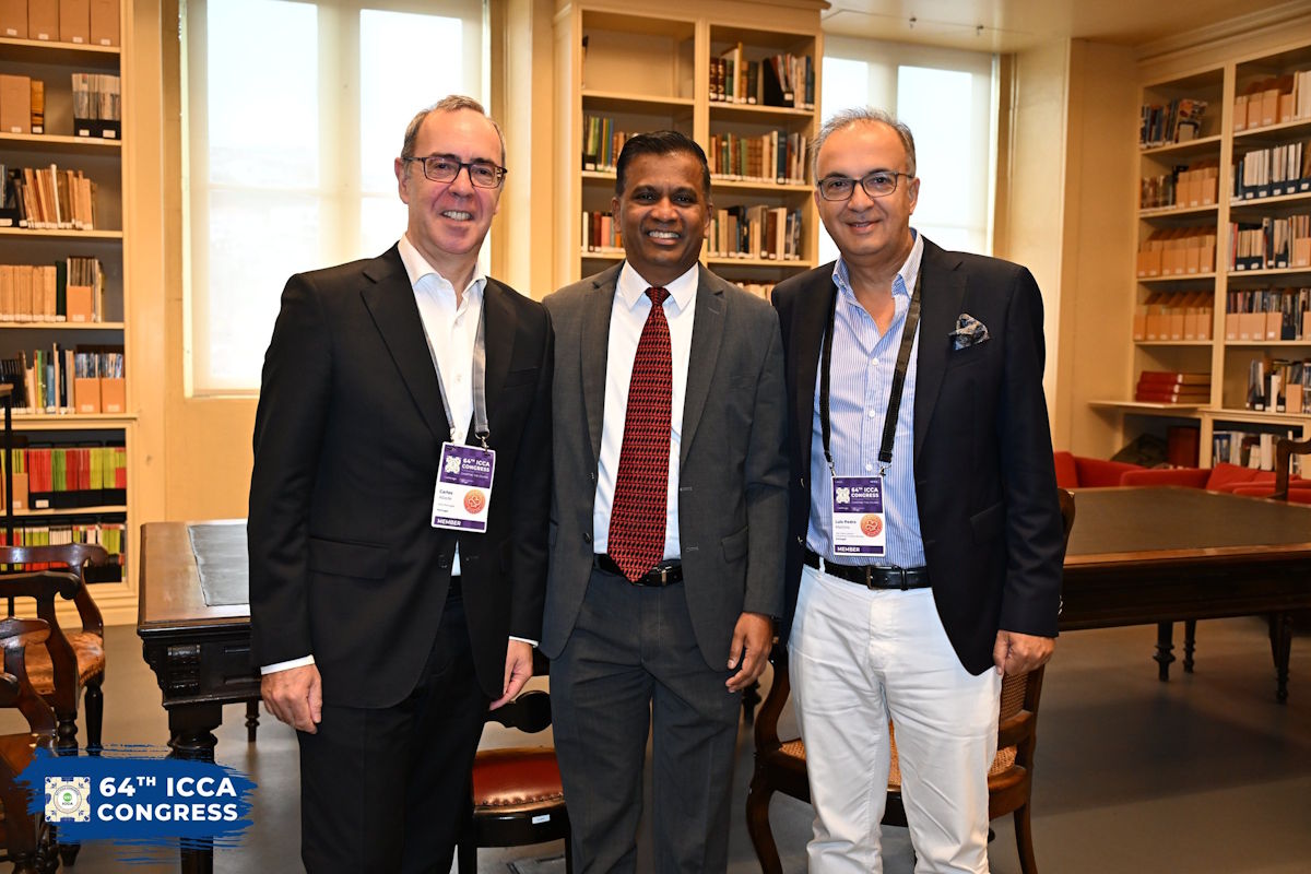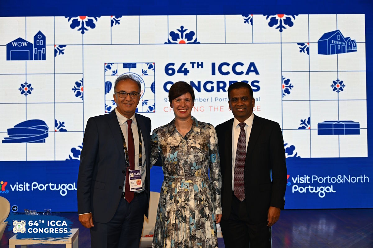 Marta Gomes, presidente da ICCA, ladeada por Luís Pedro Martins e Senthil Gopinath, CEO da Associação