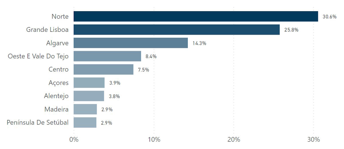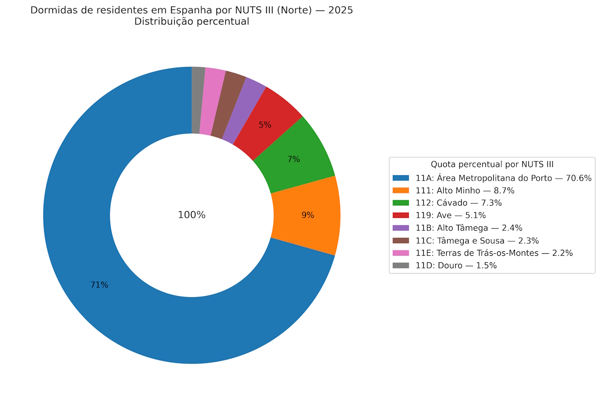 Se a nível nacional a Espanha é o 2.º mercado em hóspedes e o 3.º em dormidas, para a região Norte a liderança é absoluta. Espanha é o 1º mercado de procura externa para a região. O Norte é o principal destino nacional dos turistas espanhóis, absorvendo 29,1% do total de dormidas deste mercado em Portugal, em 2024. Este domínio acentuou-se no primeiro semestre de 2025, com a quota regional a subir para os 30,6%, como se pode verificar no gráfico seguinte.