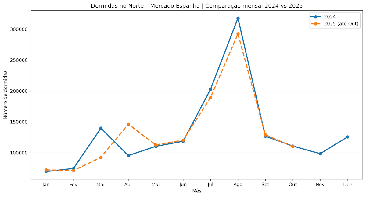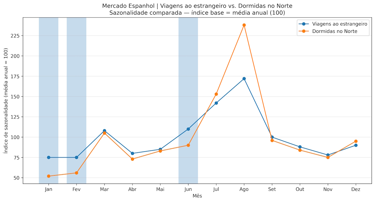 Oportunidades estratégicas: No gráfico anterior observa-se uma subcaptação clara nos meses de janeiro, fevereiro e junho. Nestes meses, os espanhóis viajam para o estrangeiro, mas o Norte de Portugal não consegue atrair uma quota proporcional. O desafio para os stakeholders não é o verão — que já está consolidado —, mas sim criar ofertas atrativas para o inverno e o início da época alta.