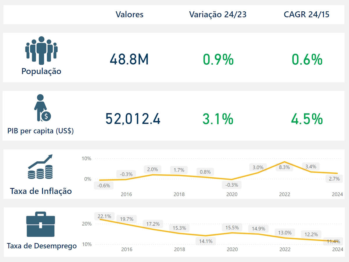 Com uma população de 48,8 milhões de habitantes, a Espanha gera cerca de 8,9% do PIB da União Europeia – números de 2024. A sua economia, fortemente orientada para os serviços (77,2% do PIB), mantém o turismo como um setor de relevância crítica. Mais do que turistas, os espanhóis são os nossos principais parceiros comerciais: em 2024, a Espanha foi o 1.º cliente das exportações portuguesas de bens (quota de 26,5%) e o 1.º fornecedor das nossas importações (33,1%).
